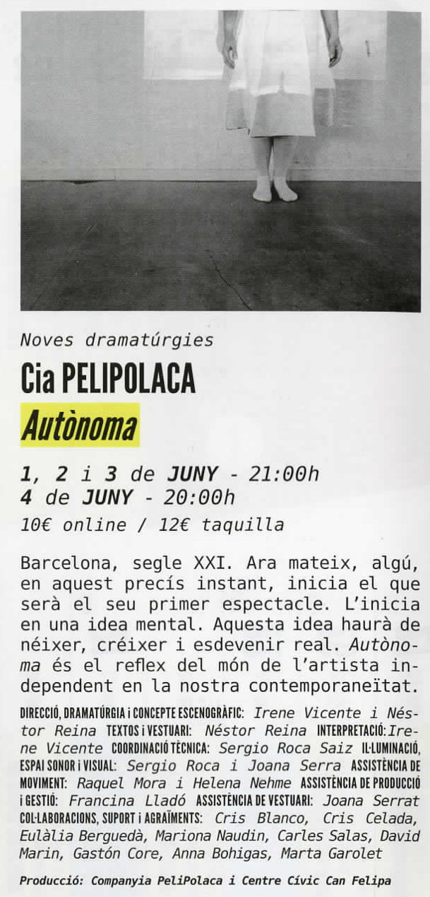 Maig 2017. Autònoma, creació i direcció d’Irene Vicente i Néstor Reina. Centre Cívic Can Felipa, Barcelona.