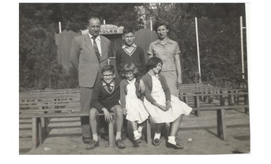 Jaume Anglès i Guzmán i María Vergara Salaberri amb els fills Jaume, Josep, Maria Jesús i Maria Victòria davant del castellet de putxinel·lis al Turó Park (1955) (© Anglès)