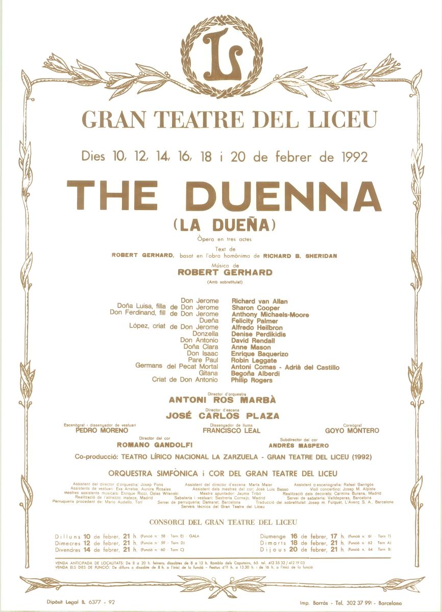 Robert Gerhard, compositor dodecafònic deixeble d'Arnold Schönberg, va estar interessat en la música escènica des de ben jove, amb els ballets Ariel (1934), Don Quixot (1940-1941) i Pandora (1943-1944). L'òpera The duenna, escrita de 1945 a 1947, fou estrenada en versió radiofònica a la BBC de Londres el 1949 i, dos anys més tard, en versió escènica en el marc del Festival de la Societat Internacional per a la Música Contemporània a Wiesbaden. Representa el primer i darrer intent d'entrar en el món de la lírica, d'enorme compromís a partir del sistema compositiu que emprava. Tanmateix, atesa la importància de la seva obra, és una obra de gran interès.