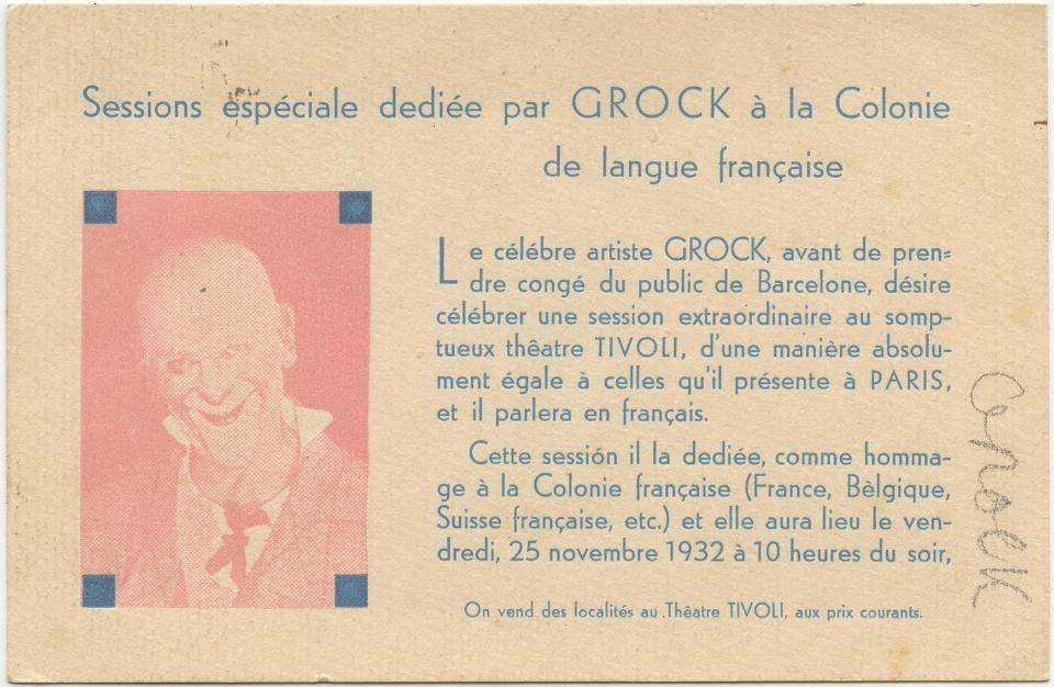 En aquesta estada a Catalunya, Grock manté una llarga conversa amb el crític Joan Tomàs (12/11), dedica una sessió especial en francès al Tívoli per a la colònia francòfona barcelonina (25/11) i actua al teatre Fortuny de Reus (29/11).