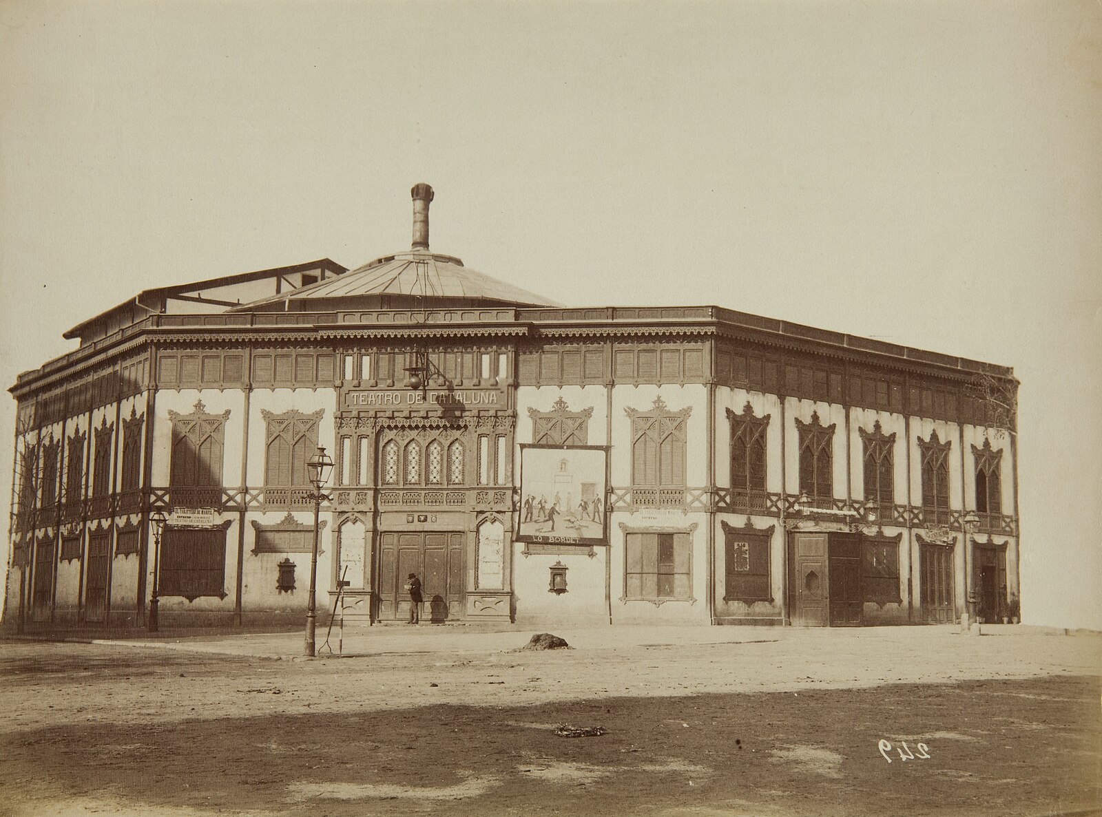 El primer edifici, projectat per l'arquitecte Baltasar Pons, era una barraca molt senzilla i fou construït en un mes i mig. El cronista del Brusi el descrivia així: «Semicircular, sencillo y elegante, con butacas de platea, dos órdenes de palcos y una galería encima de ellos para el público y con corredores adjuntos a los palcos. Su capacidad es algo mayor que la del Español. Como edificio un balcón más, pulcra y cuidadosamente presentado».