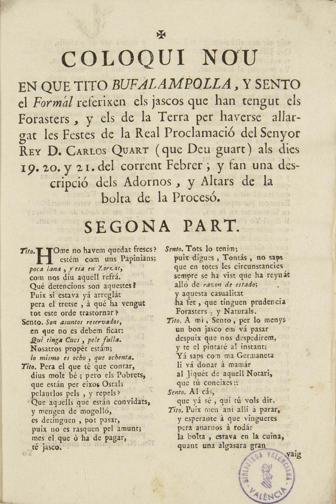 Figura 2. Leon, Carles. Coloqui nou en que Tito Bufalampolla y Sento el Formal referixen els jascos que han tengut els Forasters... València: Salvador Fauli, 1789. Font: Biblioteca Valenciana.