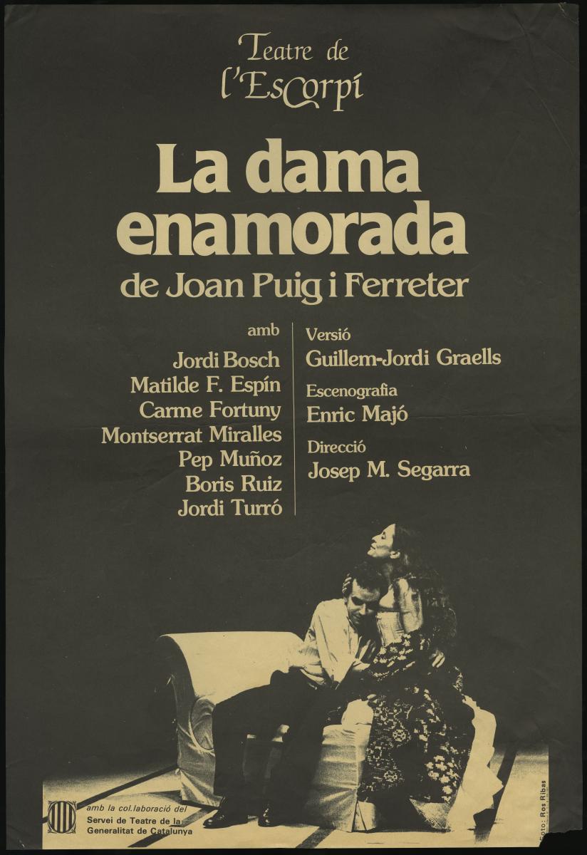 La dama enamorada, l’obra modernista per excel·lència (Foguet, 2003, p. 83), va ser el primer èxit sonat de Joan Puig i Ferreter després d’una arrencada en el món de l’escena amb resultats desiguals (Graells ,1971, p. 71). Se’n van fer diversos muntatges en català, castellà i francès; no obstant això, i conscient de la durada extrema de l’obra, Puig la va reescriure amb l’objectiu de compactar-la: va fer que passés de cinc a tres actes, va apostar per una economia de llenguatge més marcada, va concentrar l’acció i va retallar alguns dels personatges secundaris (Fàbregas, 1978, p. 202). Aquesta nova versió es va publicar l’any 1924, tot i que no es va estrenar fins a l’any 1928 al teatre Apol·lo de Barcelona a càrrec de la companyia de Mercè Nicolau. Aquesta és la versió que, generalment, s’edita i es pren com a referència per a les posades en escena des d’aleshores.