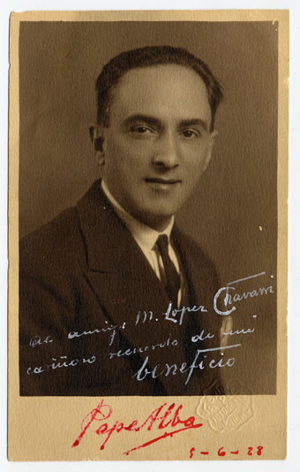 Fotografia 1: Retrat de Pepe Alba en 1928, dedicada a Eduard López Chavarri. Foto de Valentín Pla i Talens (Biblioteca Valenciana)