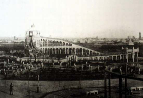 Camps Elisis de Barcelona, parc d'atraccions situat vora l'actual Passeig de Gràcia, entre els carrers d'Aragó i Rosselló. Van funcionar entre 1860 i 1876.. Font: Escena digital de Catalunya