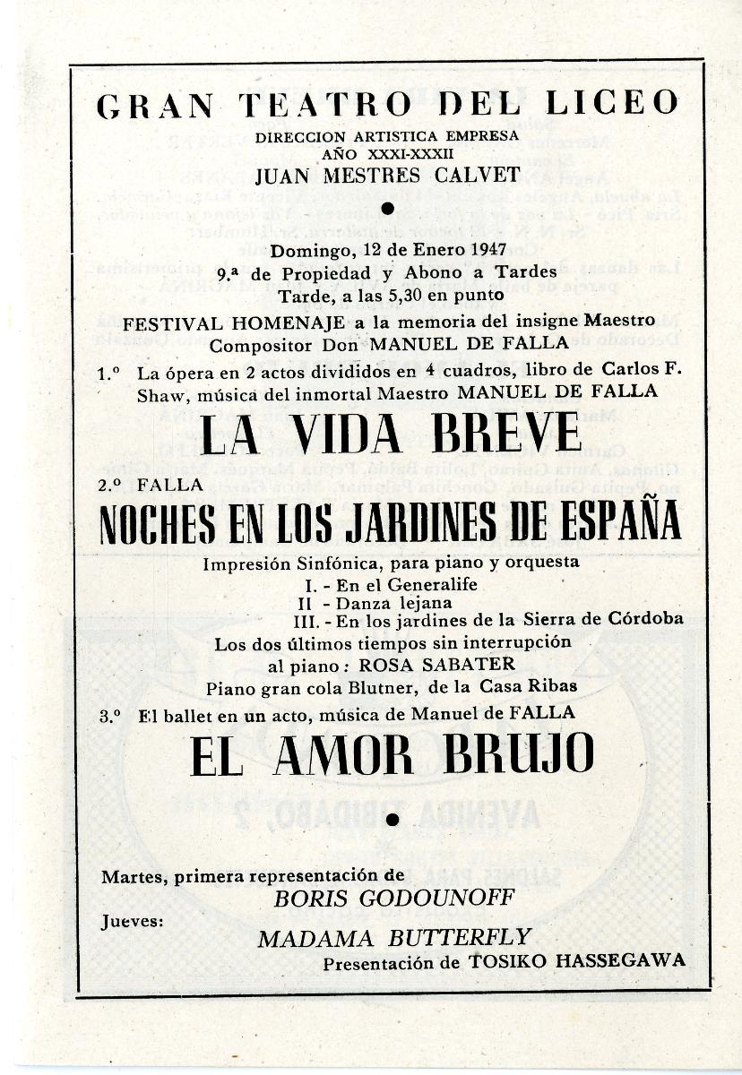 Cartell de El amor brujo. Gran Teatre del Liceu, 1947. Font: Escena digital de Catalunya