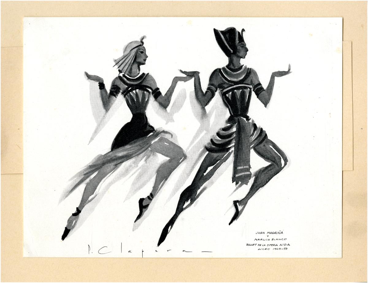 Reproducció d'un dibuix de Joan Magriñà i Maruja Blanco interpretant un ball de l'òpera Aïda al Gran Teatre del Liceu. Font: Escena digital de Catalunya