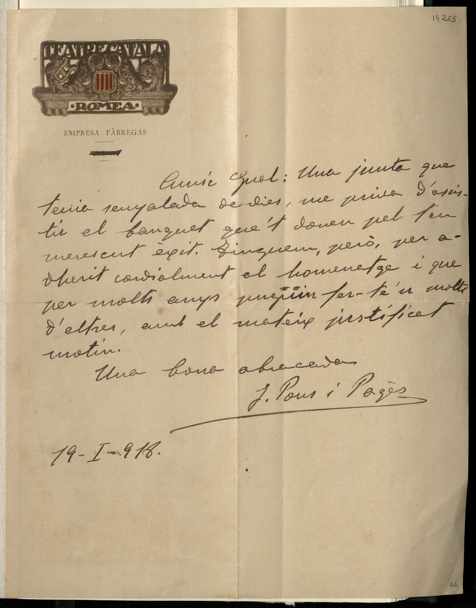Carta autògrafa de Josep Pous i Pagés adreçada a Adrià Gual. Font: Escena digital de Catalunya