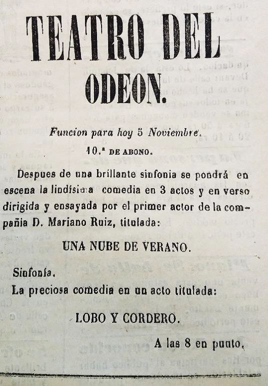 Com a que sala regent de la ciutat, al Teatre Odeon se solien representar obres de diversos actes que anaven precedides d’una simfonia i succeïdes per un breu sainet. La premsa del moment deixa constància, per exemple, de la representació de Las querellas del rey sabio de Luis de Eguílaz, seguida de la peça en un acte Los dos inseparables el febrer del 1861. També s’hi van representar òperes com ara Il Trovatore, Norma o Il barbiere di Siviglia l’estiu del 1860, i s’hi celebraven balls de màscares. De la inauguració del Teatre Odeon, el 29 d’octubre del 1857, la premsa en va dir que el local es veia amb «una forma elegant i senzilla».