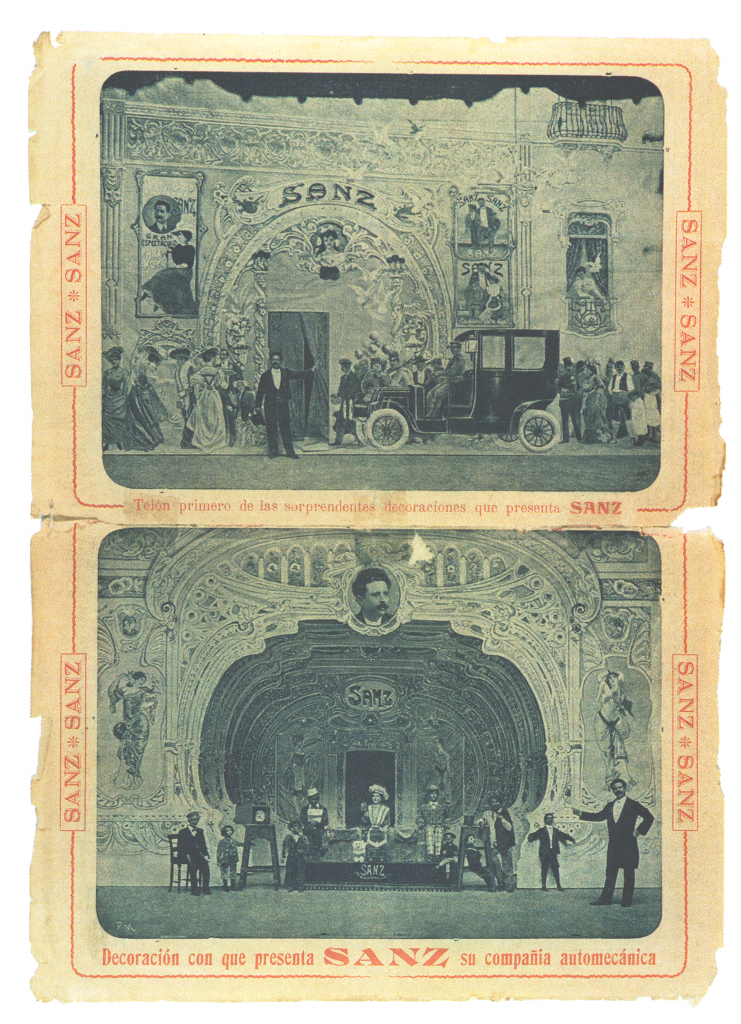 Programa on es poden apreciar els decorats i part de la col·lecció de ninots automecànics del ventríloc valencià Paco Sanz. Font: Arxiu Família Portes, Teatre Nou d'Alacant (14 març 1908).