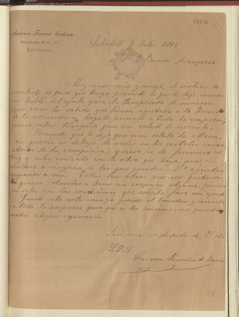 Carta de Carme Parreño adreçada a Ramon Franqueza Comas. Font: Escena digital de Catalunya