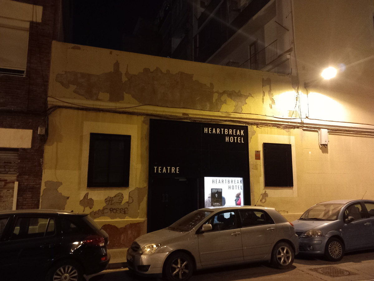 El Heartbreak Hotel teatre se situa a la plaça de l'Olivereta, al barri de Badal, a la planta baixa d'un edifici residencial, en un l'antic magatzem que havia tingut usos diversos i successius (taller mecànic i sala multiús, d'assajos de circ i d'altres disciplines artístiques). El teatre el formen tres estances: la sala (de setanta-vuit metres quadrats, aproximadament) i els espais servidors, com el vestíbul (d'uns vint metres quadrats) i els camerinos i serveis (quinze metres quadrats cadascun). L'espai del públic té grada mòbil, és flexible i varia amb cada espectacle. Així, per exemple, en la representació inaugural, de L'home de teatre, encabia 72 butaques, distribuïdes en cinc fileres al costat llarg de la sala. En canvi, Who is me, sobre textos de Pier Paolo Pasolini, es reposà recuperant el contenidor tancat, amb el públic a l'interior, en un banc perimètric. La sala de petit format, amb un espai escènic mínim que no està ni elevat ni emmarcat, destaca pels seus murs rotunds, de maó, pintats de negre, i paraments de fusta també tractada i enfosquida. Els arquitectes responsables de la reforma són Francesc Guàrdia i Riera, i Xavier Massagué, socis del despatx GAC (Guàrdia Arquitectura Col·laborativa), i l’enginyer acústic Oriol Arau. Guàrdia és autor d'altres projectes i reformes en teatres barcelonins, com ara el teatre de l'Espais Texas i, anteriorment, participà en l'execució del Teatre Lliure de Montjuïc.
