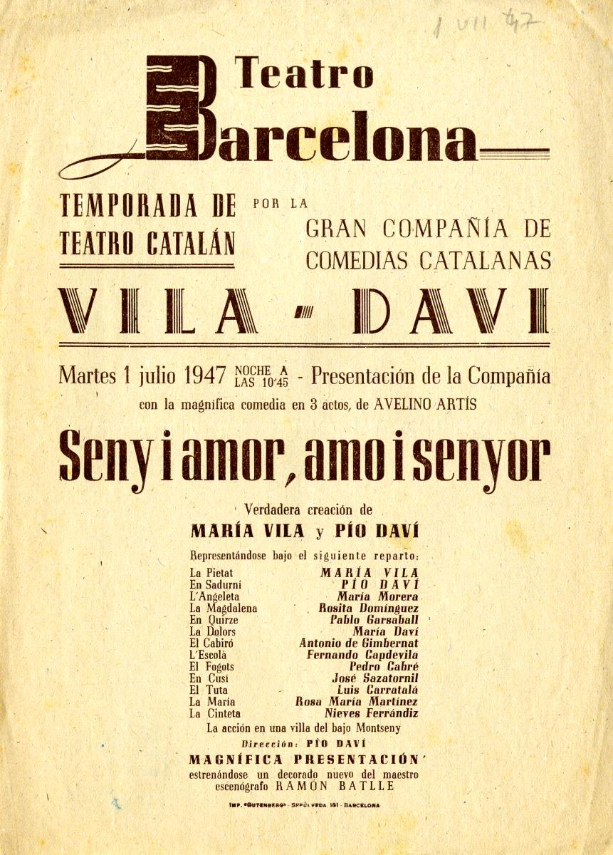 Compañía Vila - Davi. Seny i amor, amo i senyor de Avel·lí Artís. Teatro Barcelona, 1 julio 1947. Font: Escena digital de Catalunya