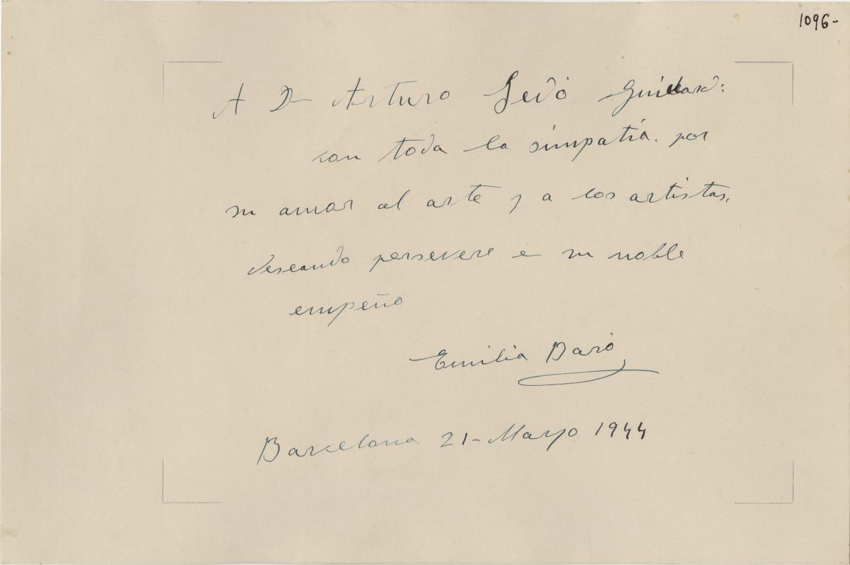 Una dedicatòria a Artur Sedó. 21 març 1944 / Una carta autògrafa. Col·lecció Canals. Font: Escena digital de Catalunya