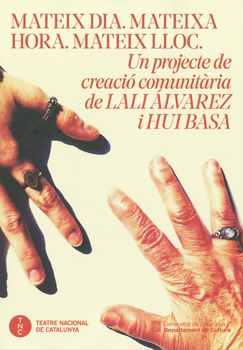 Programa de mà de l'obra Mateix dia. Mateixa hora. Mateix lloc. de Lali Álvarez i Hui Basa. Representada al Teatre Nacional de Catalunya (2019).. Font: Escena digital de Catalunya