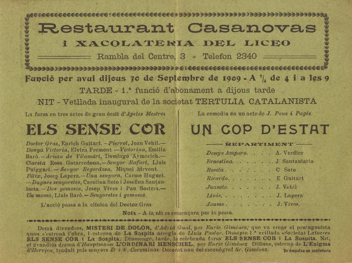 Programa de mà d'Els sense cor i Un cop d'estat. Teatre Català Romea, 30 setembre 1909. Font: Escena digital de Catalunya