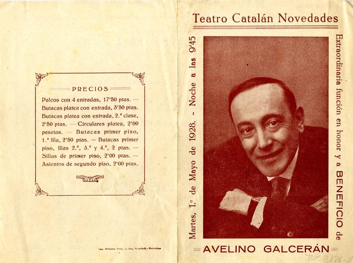 Programa de mà d'una funció en honor a Avel·lí Galceran, on apareix un retrat de l'autor.. Font: Escena digital de Catalunya