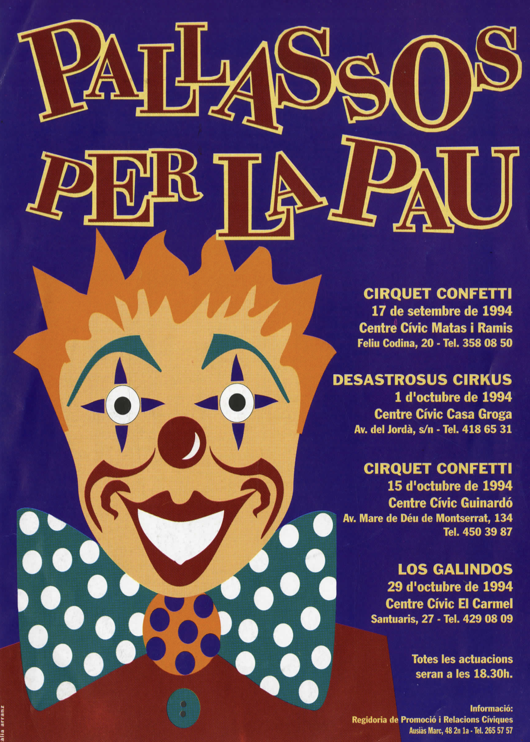 Pallassos per la Pau. Centre Cívic Matas i Ramis. Centre Cívic Casa Groga. Centre Cívic Guinardó. Centre Cívic El Carmel, 17 setembre - 29 octubre 1994. Font: Escena digital de Catalunya