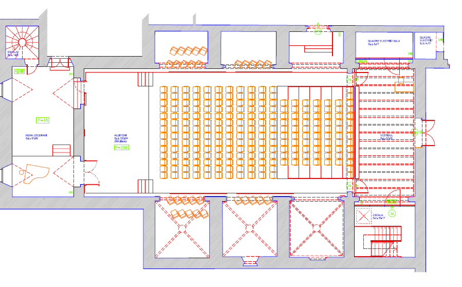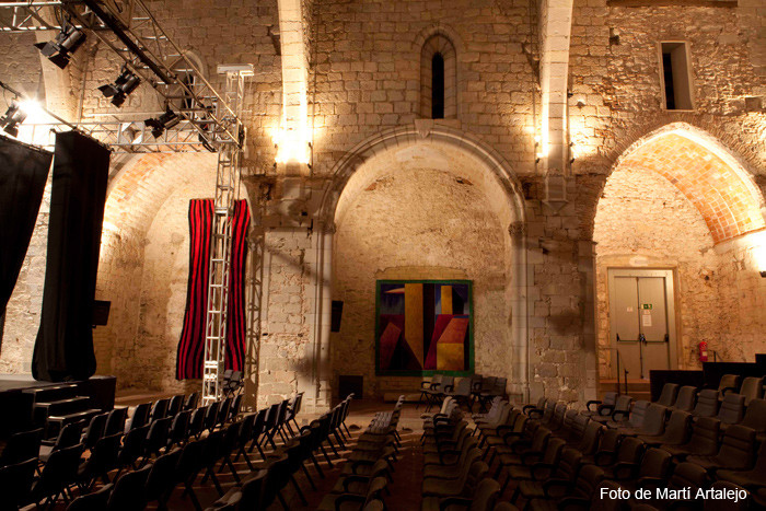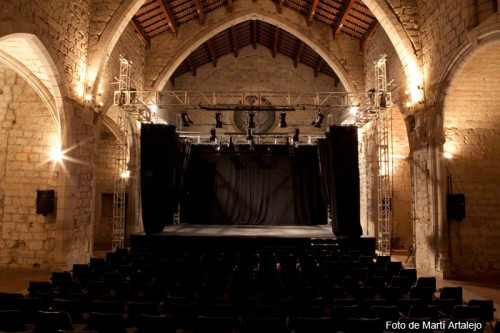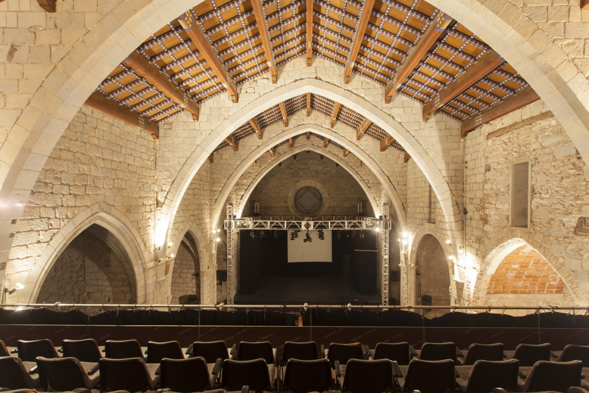 Pel que fa a l’Auditori, es tracta d’una sala estructurada a partir d’una nau central amb capelletes laterals i rematada amb arcs ogivals i un sostre de fusta policromada. La seva distribució és canviable, si bé en la gran majoria de les ocasions hi ha muntada una grada amb capacitat per a 250 persones. L’escenari és fet de tarimes de rosco amb planxat de fusta negra de 10 metres de llarg per 7 metres de fondària i generalment conté càmera negra a la italiana. Al seu torn, les primeres capelles poden utilitzar-se a mode de llotja.