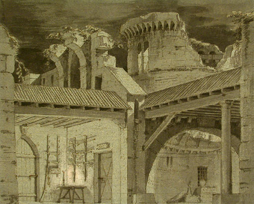 Fig. 3 Giuseppe Lucini, Interior d’un castell en runes, tècnica mixta, Museu de les Arts Escèniques de Barcelona, 1802. Topogràfic: P8.