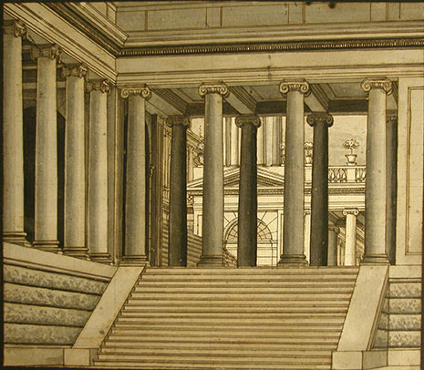 Fig. 1 Giuseppe Lucini, Escalinata que porta a l’interior d’un temple, amb un pòrtic de columnes jòniques a l’entrada, técnica mixta, Museu de les Arts Escèniques de Barcelona, c. 1820. Topogràfic: escE 4.