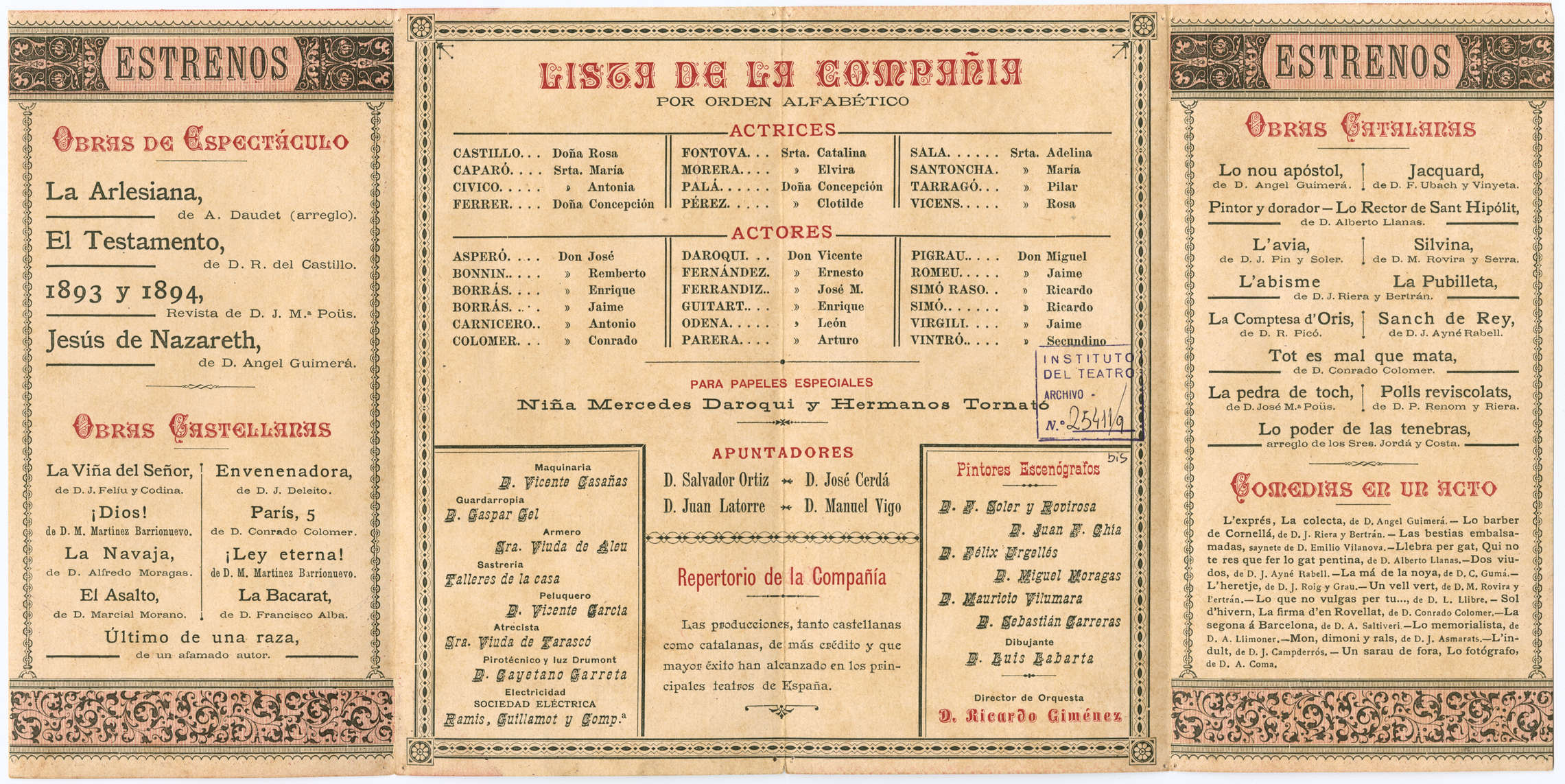 Teatre Novetats, temporada d'hivern 1893/1894, on apareix Vilomara com a escenógraf.. Font: Escena digital de Catalunya